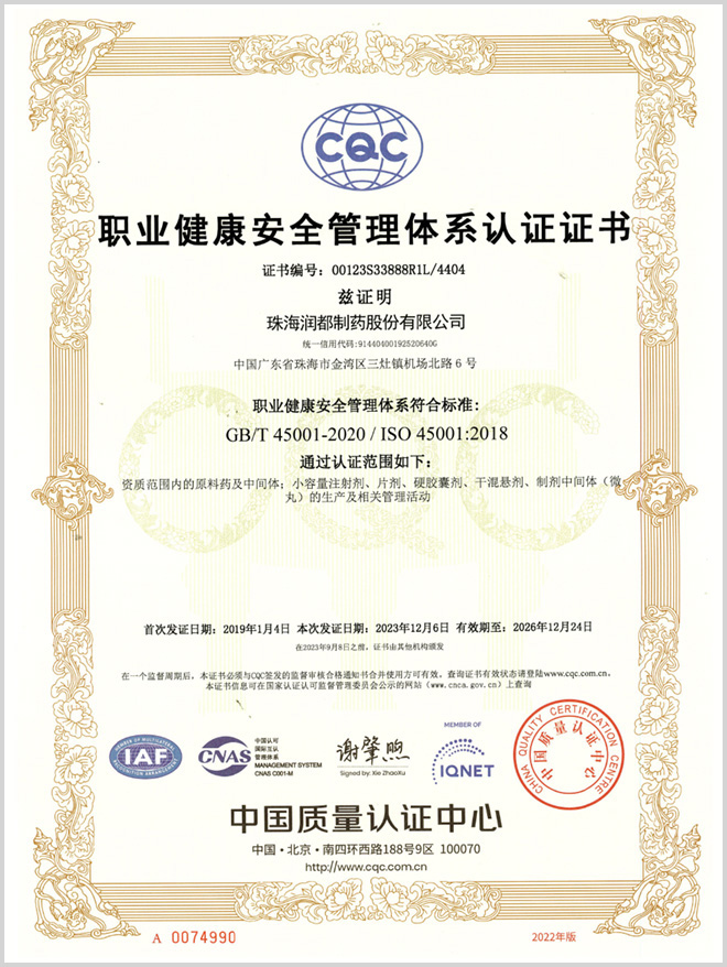 珠海潤都制藥股份有限公司職業(yè)健康安全方針: